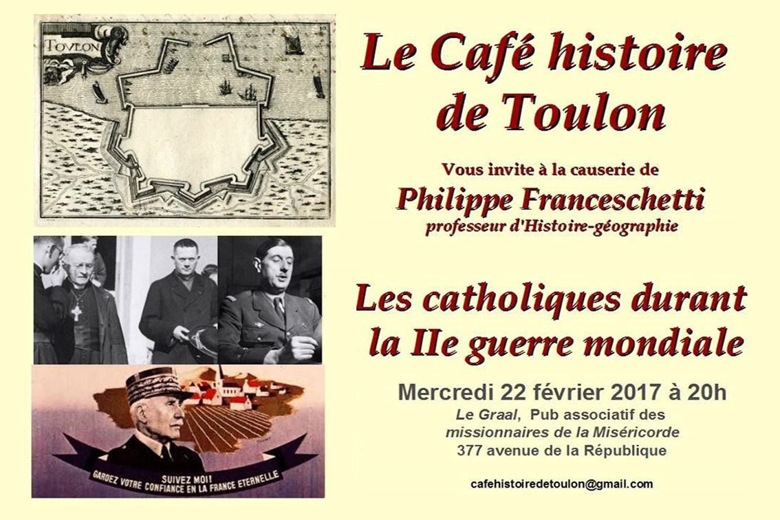 Le professeur d'Histoire Philippe Franceschetti exposera les difficultés des catholiques français plongés dans la tourmente de la guerre entre 1939 et 1945. Les enjeux de l’époque les ont poussés à répondre à une question de conscience : comment réagir face à l’Occupation, au régime de Vichy et à la Résistance ? Dans ce contexte, comment s’est poursuivie la vie de l’Eglise en France ? S'engager dans le vie politique et sociale sans renier leur foi devient alors un problème auquel les catholiques, clergé comme laïcs, apportent des solutions diverses. •